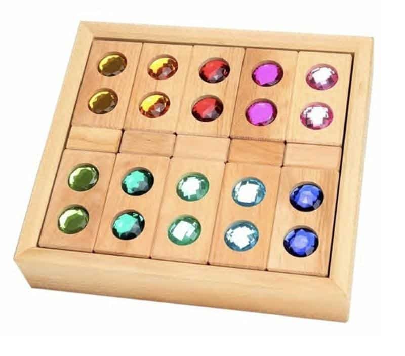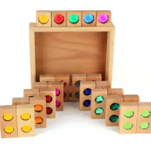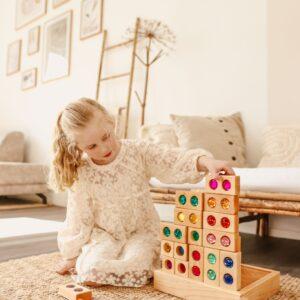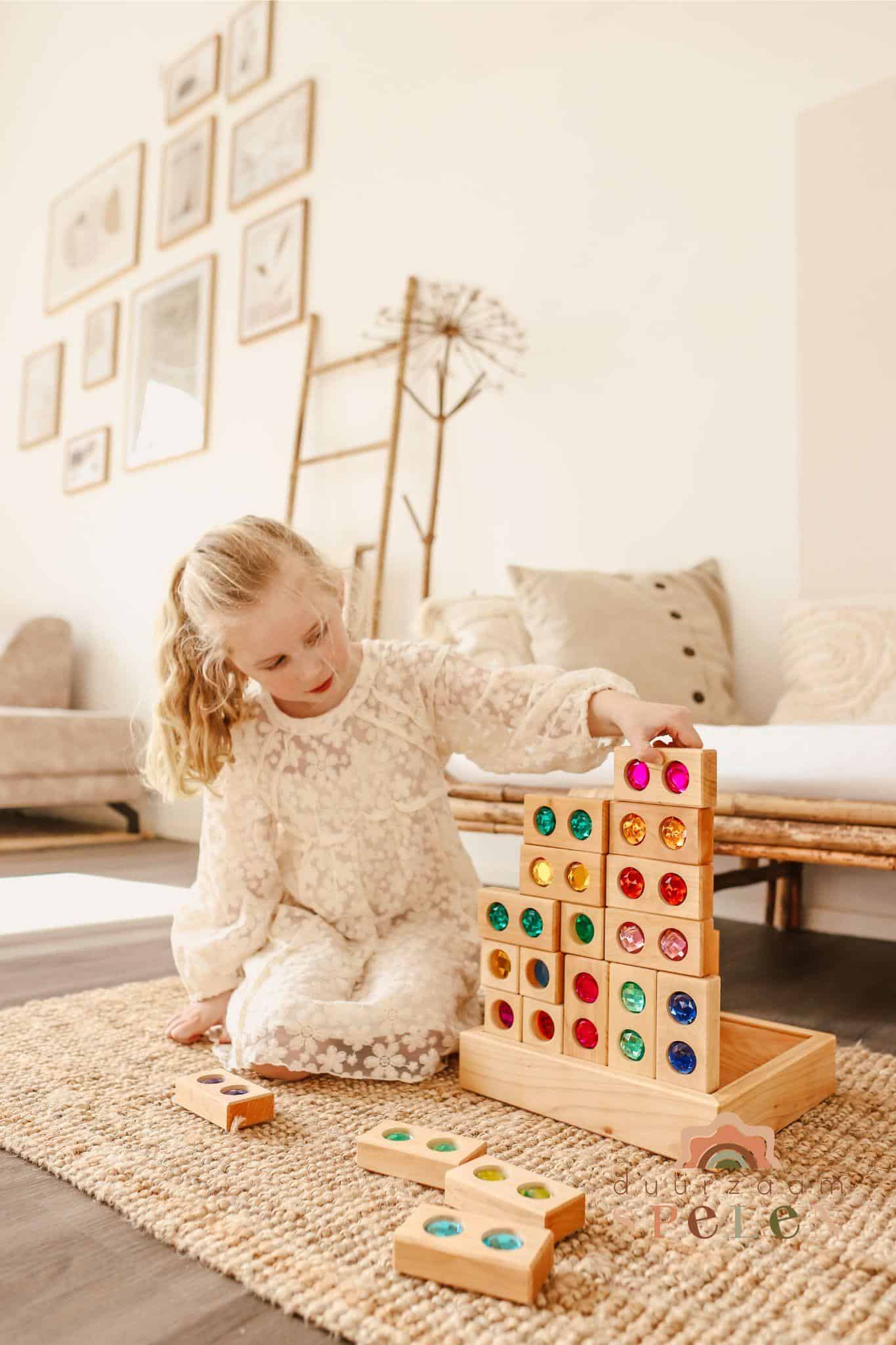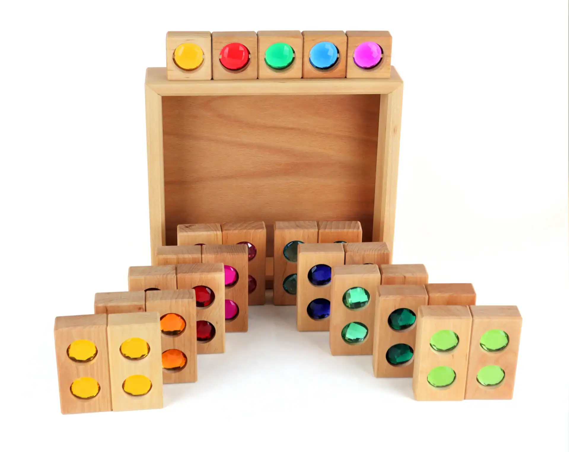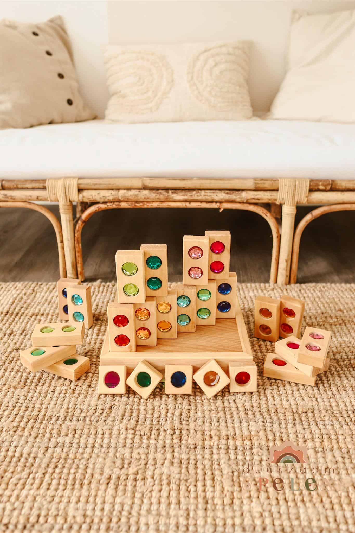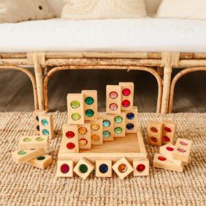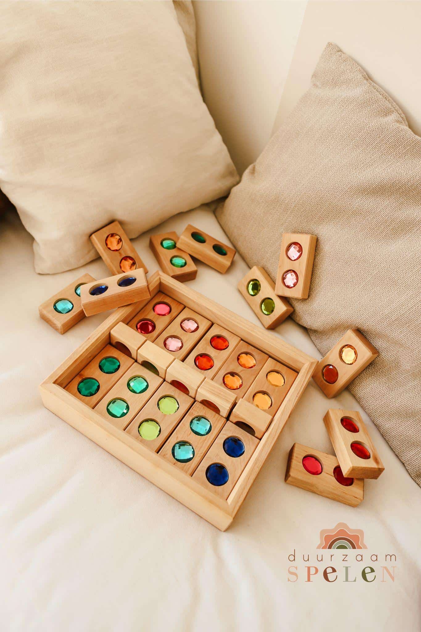 - Deze set bestaat uit 20 houten glinsterblokken en 5 houten vensterblokken