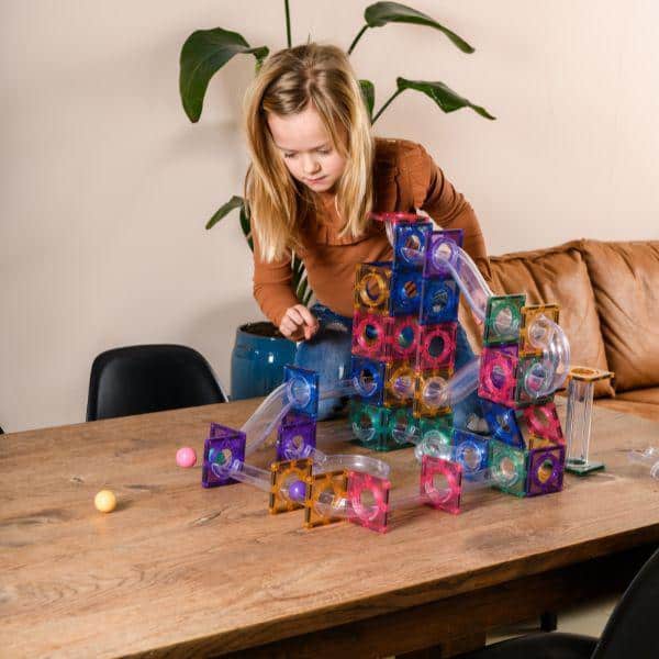 Bovendien is deze magnetische knikkerbaan eenvoudig op te bouwen. Zelfs jonge kinderen kunnen al snel meedoen, terwijl oudere kinderen steeds complexere constructies bedenken. Hierdoor groeit het spel mee met de ontwikkeling van je kind.