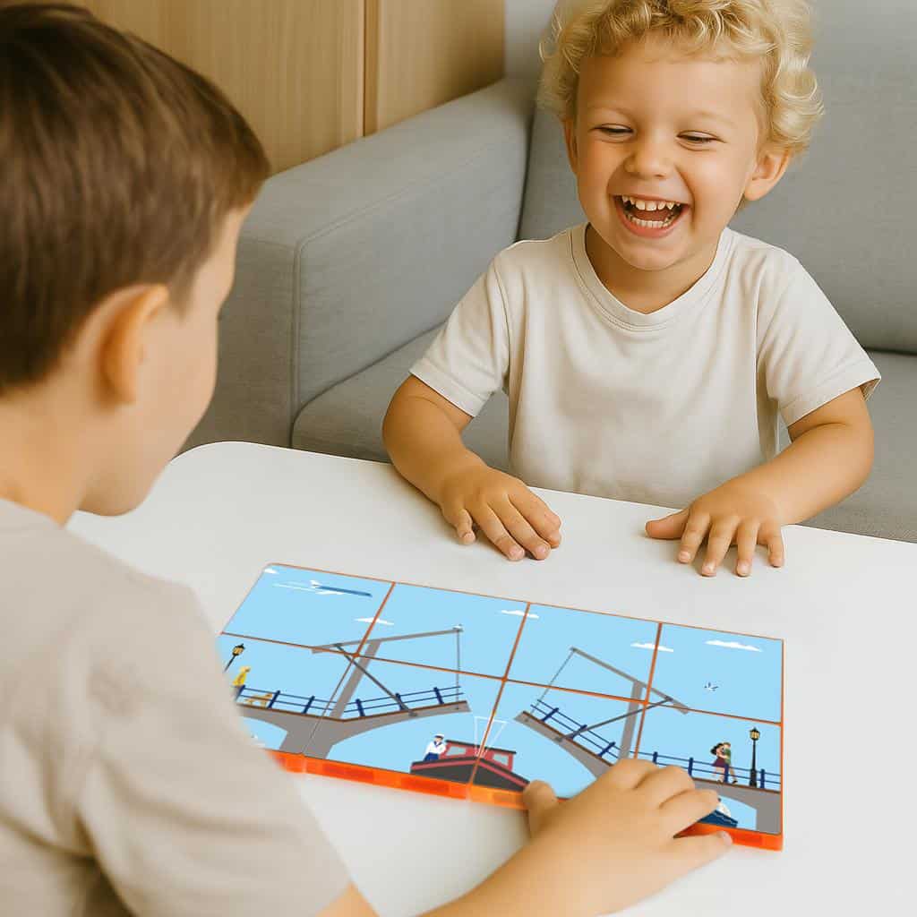 Kinderen koppelen de magnetische kaartjes eenvoudig aan elkaar op de Coblo stenen. Door de juiste toppers te combineren, bouwen ze stap voor stap hun eigen stad. Dit kan liggend op tafel als puzzel, maar ook staand in 3D, waardoor de stad echt tot leven komt.