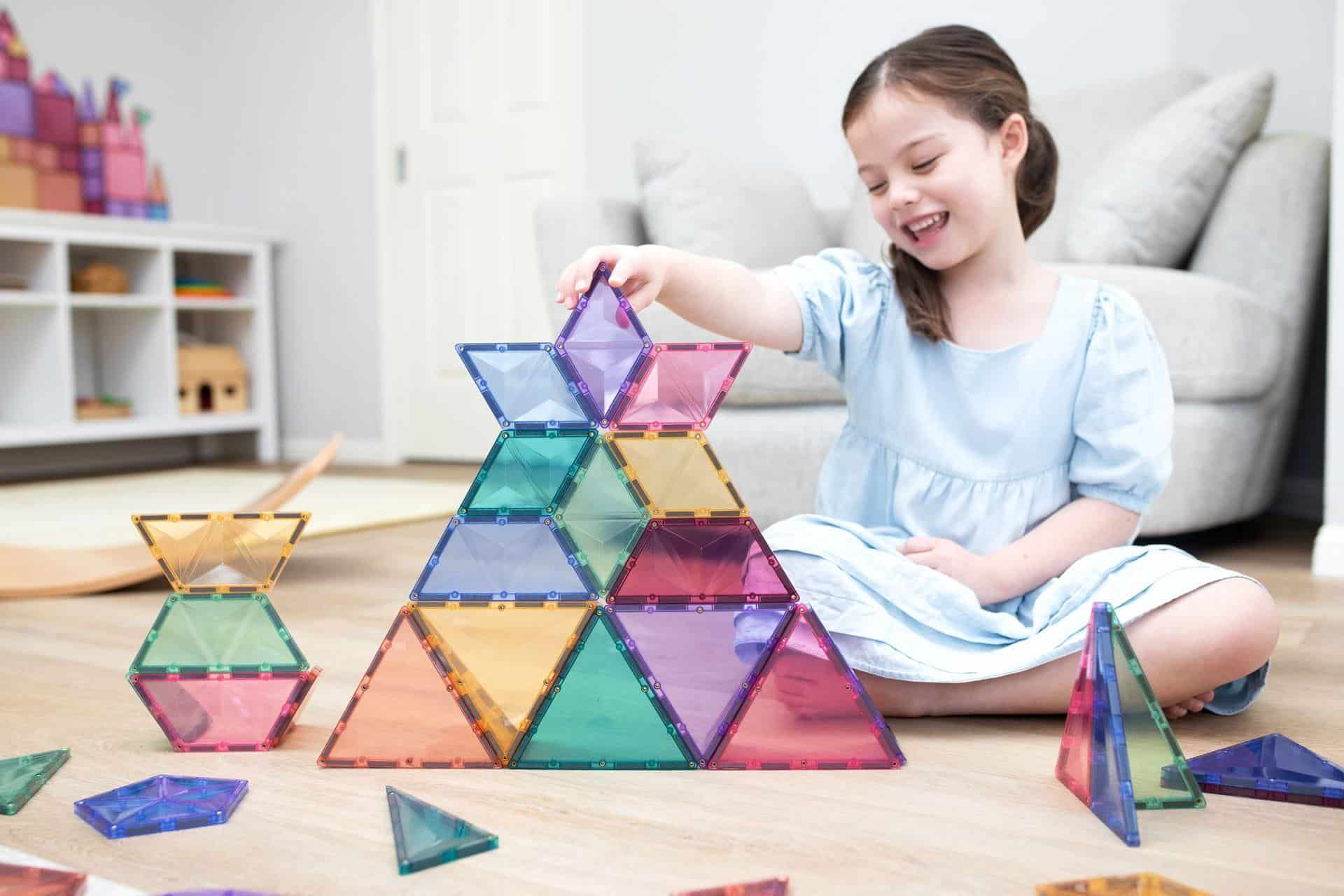 Stimuleer de verbeelding als kwartcirkels kronkelende wegen, kasteelkoepels of pizza en taart worden die gelijkelijk kunnen worden gedeeld! Bewonder hoe grote rechthoekige driehoeken veranderen in stevige raketvinnen, autohellingen en tegelijkertijd extra ondersteuning toevoegen. Vergroot het bewustzijn van vormen terwijl je trapeziums en ruiten samenvoegt om een grote zeshoek te creëren, of geniet van het ontwerpen van een reeks bloemen en vlinders. Daag je innerlijke ingenieur uit om vijfhoeken te gebruiken om een oogverblindende koepel te creëren.