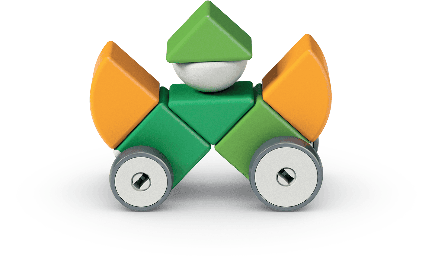 De set bevat 13 magnetische onderdelen. Er zitten 4 verschillende vormen in: blokken, bogen, kegels en halve bollen. Daarnaast zijn er echte wielen inbegrepen. Alle onderdelen klikken dankzij magneten moeiteloos aan elkaar vast. Zo kunnen kinderen hun eigen voertuigen, dieren of fantasiefiguren bouwen en laten rijden.