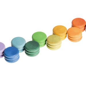 36 Houten munten in 12 kleuren. Van elke kleur zitten er 3 munten in deze set.