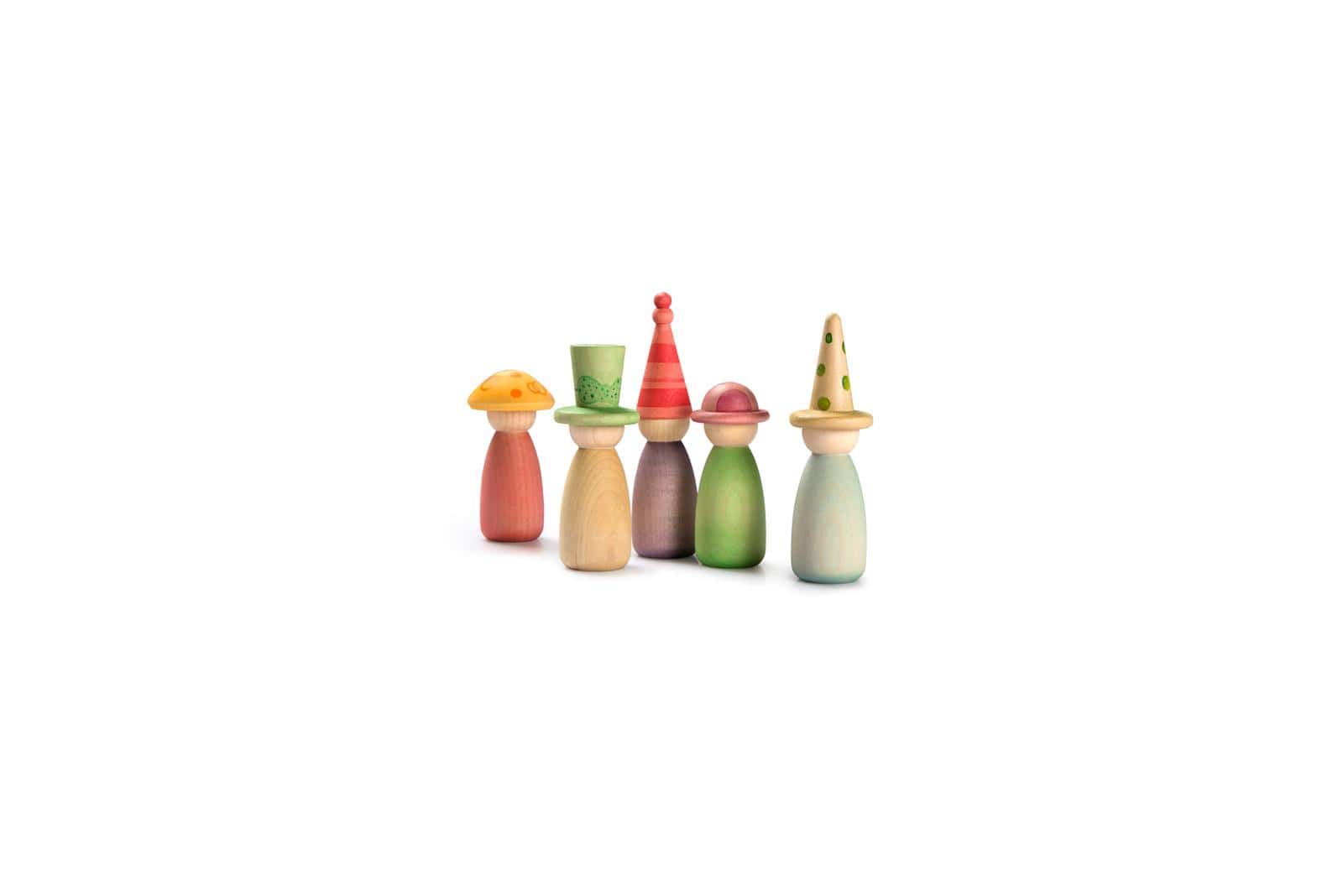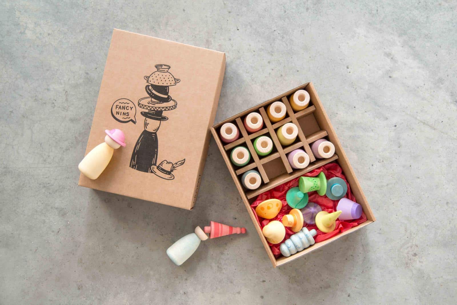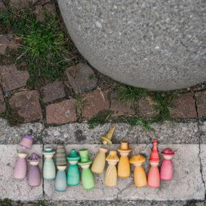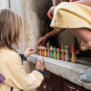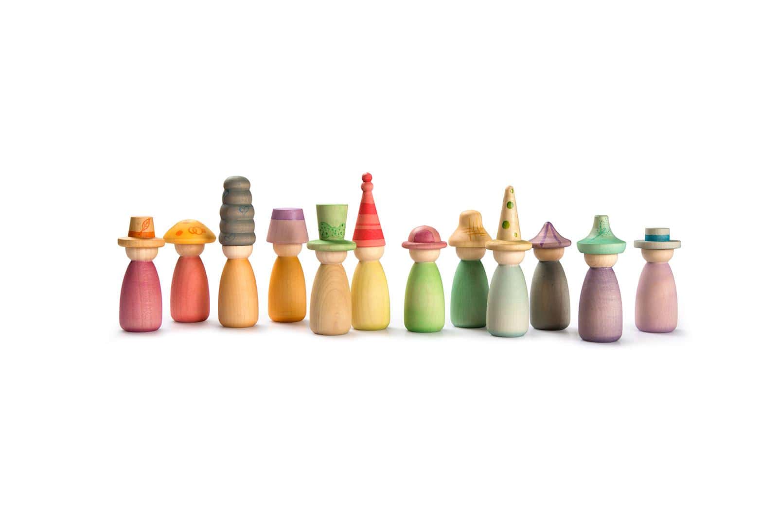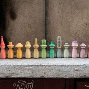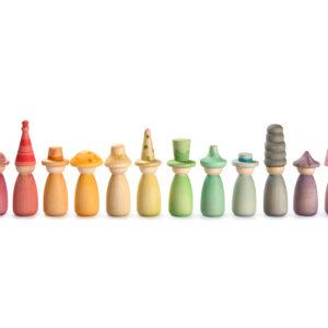 De set bevat 12 Nins met de hand gekleurd in onze 12 kenmerkende kleuren van de regenboog met verwisselbare hoedjes en lichamen om nog meer kleurrijke combinaties te maken!