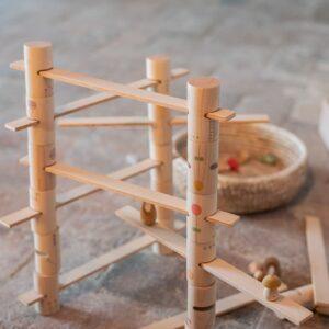Een prachtige houten set bestaande uit 18 buisjes en 9 plankjes. De houten blokken zijn met de hand geschilderd en hebben een natuurlijke uitstraling. Breng je fantasie tot leven en maak de mooiste bouwwerken. Wat ga jij vandaag maken? Wordt het een boomhut of een dierentuin? Met een beetje creativiteit en geduld maak je ontelbaar veel constructies met deze set.