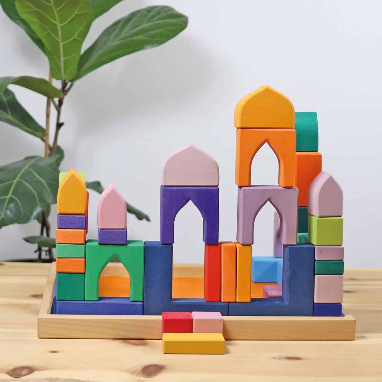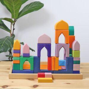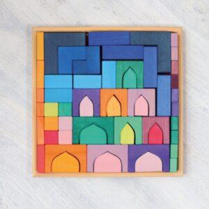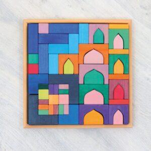 Met deze bouwset van GRIMMs kun je werelden creëren zoals in 1001 Nachten. Zelfs de allerkleinsten worden aangetrokken door de intensieve kleur- en vormentaal. Hoe ouder de kinderen, hoe fantasierijker en gedetailleerder de betoverende paleizen worden – prachtig om te combineren met bijvoorbeeld glasstenen, zijden sjaals, zand en poppetjes (niet inbegrepen in de bouwset). Tijdens het bouwen en spelen worden ook de fijne motoriek en het ruimtelijk denken van de kinderen getraind. Het viltdoek zorgt ervoor dat de bouwstenen beter aan de grond blijven plakken en geeft de gebouwen een warme basis in het frame. 54 bouwstenen inclusief vilt in een houten frame.