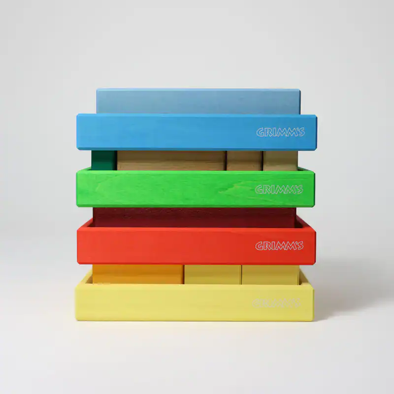 Deze bouwset maakt deel uit van de serie vier kleur-bouwspellen van GRIMM’s. Door de grote, stevige blokken zijn ze perfect voor kleine kinderhanden. Bovendien leren kinderen spelenderwijs de werking van primaire en secundaire kleuren kennen.