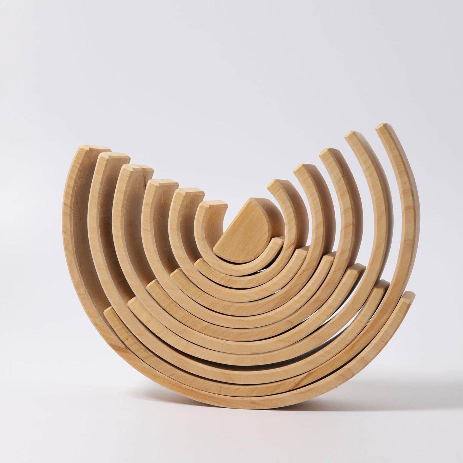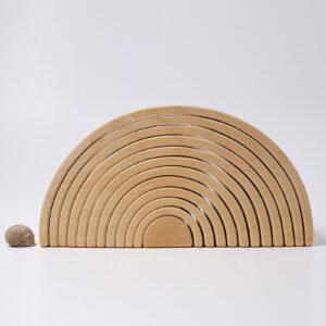 Zeg je GRIMM’s, dan zeg je regenboog. Deze 12-delige set in naturel uitvoering is erg veelzijdig en geschikt voor jong en oud! Stapelen, sorteren, bouwen; zomaar een aantal ideeën voor wat je ermee kunt doen. Oudere kinderen zullen er bijvoorbeeld een tunnel of brug van maken, zodat auto’s eronderdoor/eroverheen kunnen rijden. Ook omheiningen voor dieren of bouwwerken in de meest uiteenlopende vormen kunnen gerealiseerd worden met deze regenboog.