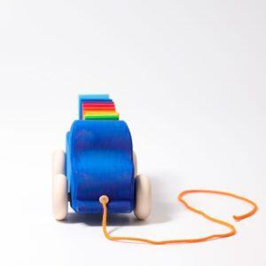 De grimms trekauto is gemaakt van lindehout en gekleurd met niet-giftige kleurbeits op waterbasis. Hierdoor blijft de natuurlijke structuur van het hout zichtbaar.
