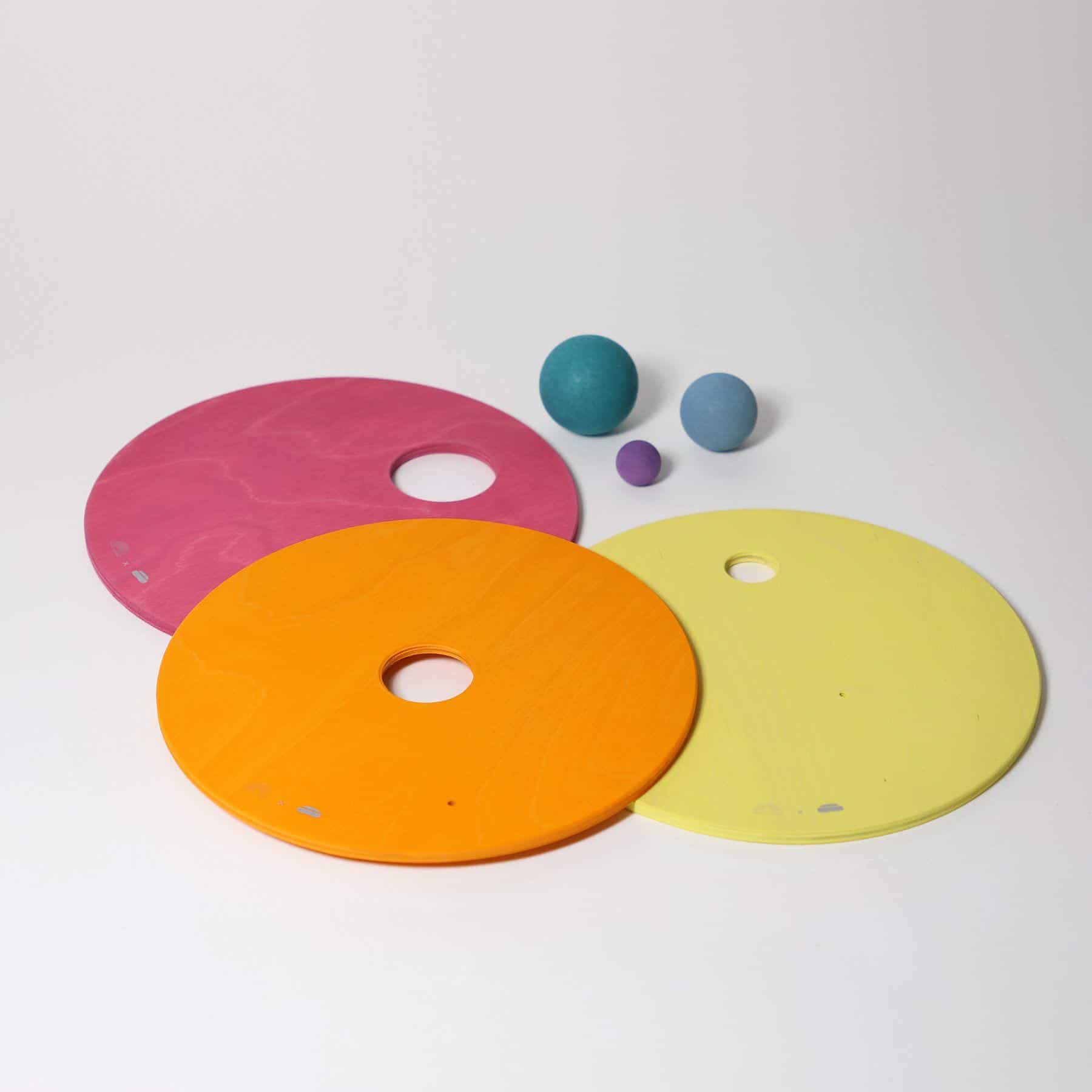Dankzij de warme pastelkleuren sluiten de schijven perfect aan bij andere producten van GRIMM’S en Stapelstein®. Ze vormen een prachtige aanvulling op open-end speelgoed en bevorderen eindeloos fantasierijk spel, zowel individueel als in groepsverband.