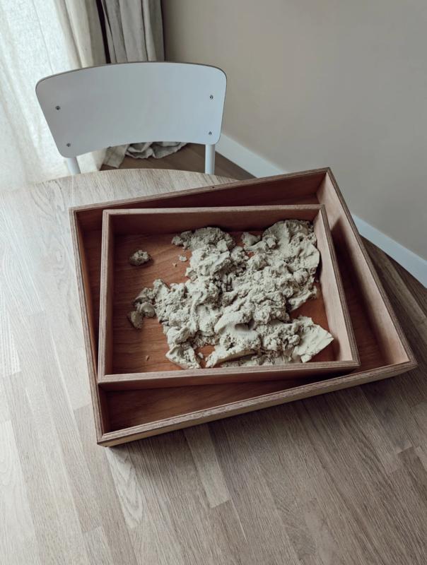 De houten speelbak met deksel optioneel van Grennn is ontzettend multifunctioneel. Zo wordt het bijvoorbeeld veel gebruikt voor het spelen met kinetisch zand. Hoewel kinetisch zand gezien wordt als geschikt speelgoed voor peuters van 3 jaar, geloven wij erin dat je vooral moet kijken naar hoe jouw kind zich gedraagt. Stopt het nog dingen in de mond? Dan is het beter om er nog even mee te wachten. Doet je kindje dit niet meer, maar heeft het de leeftijd van 3 jaar nog niet bereikt? Dan kan het wat ons betreft prima. Het zand is ook leuk te combineren met de uitstekers van Grennn.