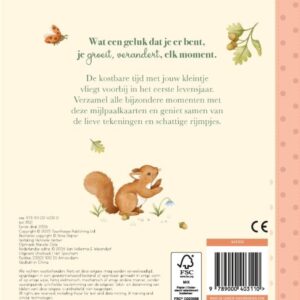 Verzamel alle mooie en bijzondere momenten van het eerste jaar van je baby met dit boek op rijm. De mijlpaalkaarten – die losstaan van de rijmpjes – kun je gemakkelijk uit het boek halen om deze samen met jouw baby op beeld vast te leggen.