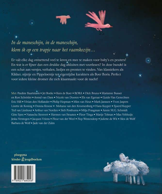 In de maneschijn, in de maneschijn, klom ik op een trapje naar het raamkozijn… Eten, knuffelen, in bad en naar bed gaan, voor het eerst naar de kapper, buiten spelen, van alles ontdekken, een broertje of zusje krijgen: baby’s en peuters maken ontzettend veel mee! En wat is er fijner dan om zo’n drukke dag af te sluiten met een boek? In deze bundel is een schat aan versjes en verhalen, liedjes en prenten te vinden.