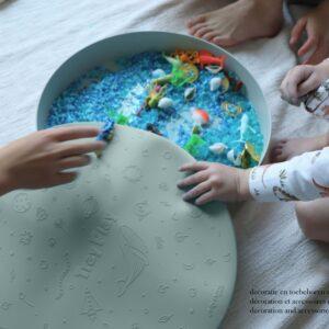 De stevige schaal is gemaakt van een duurzame mix van bamboevezel en melamine, en komt met een flexibele siliconen deksel vol prachtige texturen en illustraties van natuur, ruimte en dieren. Gebruik de deksel om de speelwereld af te sluiten, of draai hem om als sorteerbak of extra speelvlak.