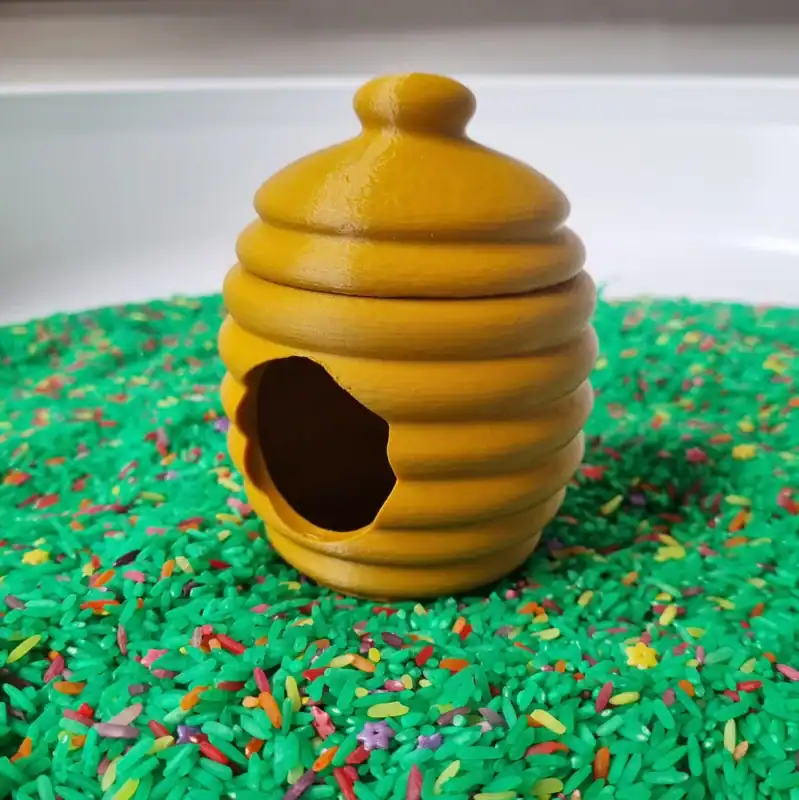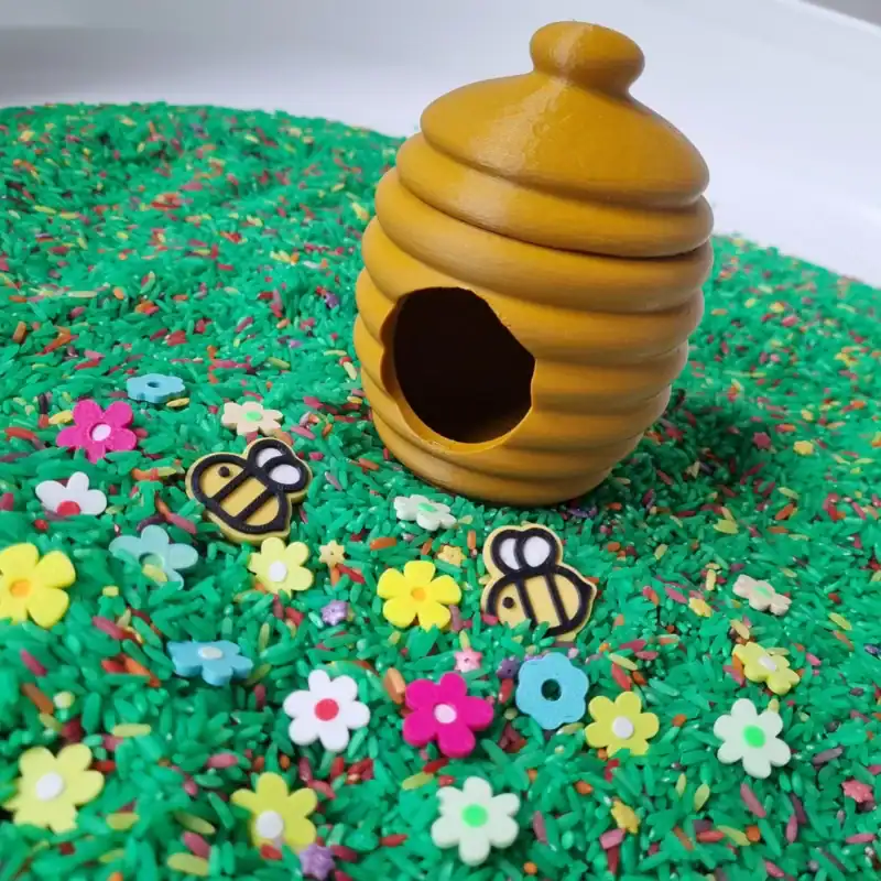 Combineer de bijenkorf met natuurlijke materialen zoals speelrijst, kikkererwten, steentjes of zand. Voeg diertjes of poppetjes toe en laat kinderen hun eigen verhaal creëren. De opening aan de zijkant maakt hem ideaal voor sensorisch spel en fijne motoriek.