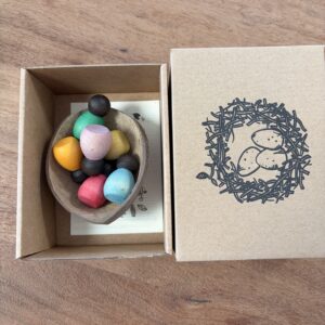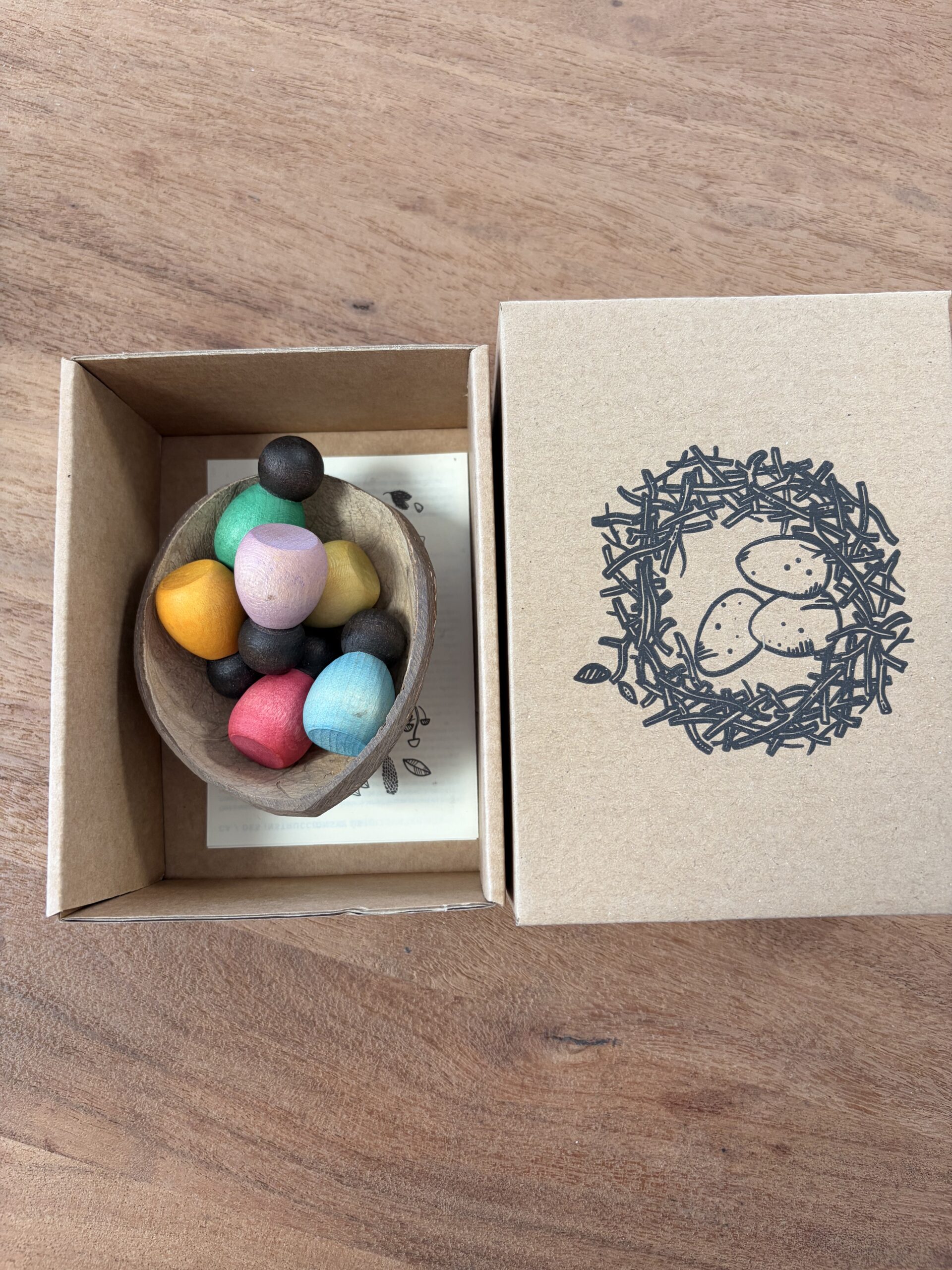 Deze set bestaat uit 6 kleine Nins® en 1 kokosnoot. De kokosnoot kan een wieg, bed of iets anders zijn.