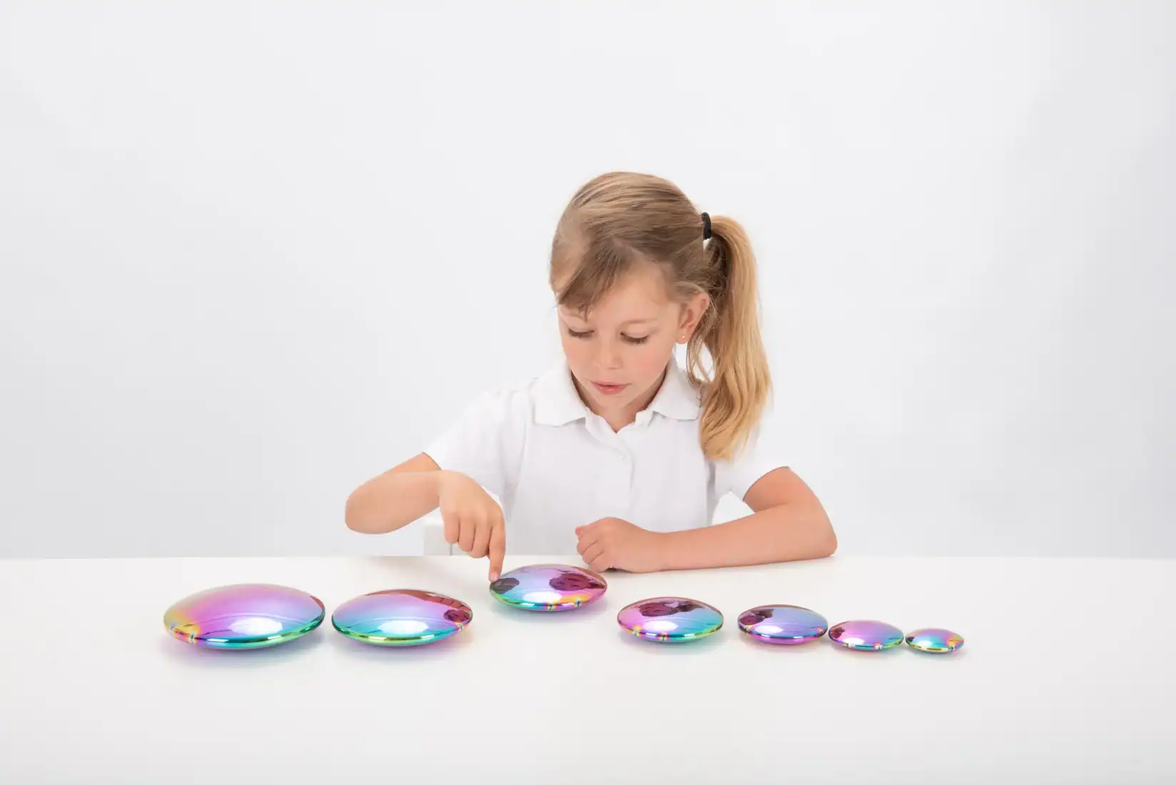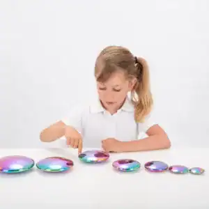 Laat je kind spelen en leren met de Tickit® Sensorische Color Burst-knoppen! Deze grote, glanzende knoppen zijn leuk om aan te raken en te stapelen. Ze reflecteren het licht en lijken wel regenboogkleuren te hebben. De set bestaat uit zeven knoppen die variëren in grootte, van klein (5 cm) tot groot (14 cm), perfect om wiebelige torens te bouwen!