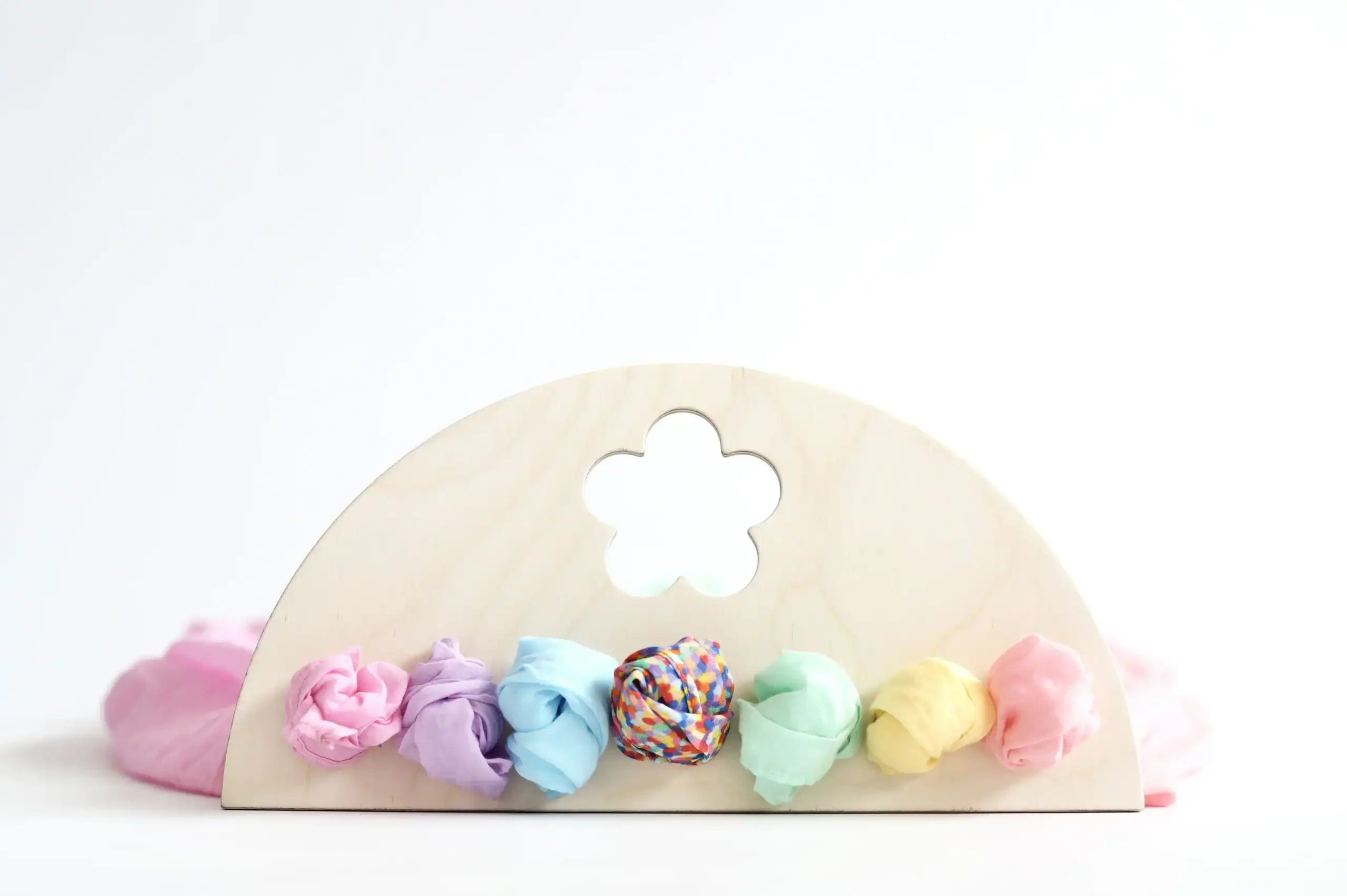 Presenteer je speeldoeken op een mooie en praktische manier met deze houten display van Laura’s Play Cotton. Deze kleine, halfronde houder is speciaal ontworpen voor het opbergen en uitstallen van speeldoeken van 50 x 50 cm. De speelse uitsnede in de vorm van een bloem geeft een extra speels accent.