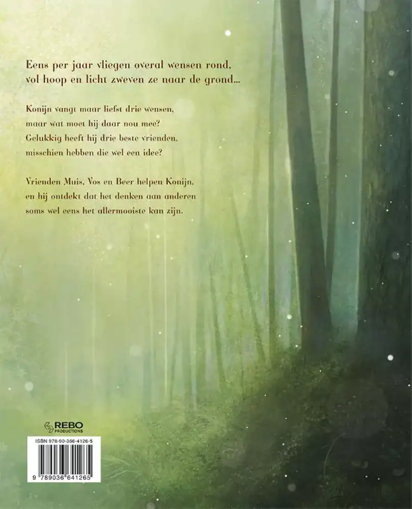 Eens per jaar, vliegen de wensen overal om ons heen. Ze glinsteren als sterren en zweven zachtjes naar de grond, klaar om in vervulling te gaan. In dit betoverende boek krijgt Konijn, samen met zijn vrienden Muis, Vos en Beer, de kans om iets heel bijzonders te ontdekken. Terwijl ze samen de wensen verzamelen, leert Konijn dat het niet altijd de eigen verlangens zijn die het meest waardevol zijn, maar juist het denken aan anderen. En zo ontdekken ze dat vriendschap en zorg voor elkaar soms wel eens het allermooiste kan zijn.