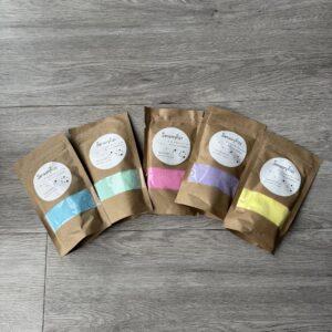 SensoryFizz is handgemaakt van veilige ingrediënten, waaronder baking soda, citroenzuur, maïzena, Epsom zout, voedselkleurstof en biologisch afbreekbaar mica poeder dat op ethische wijze is verkregen.