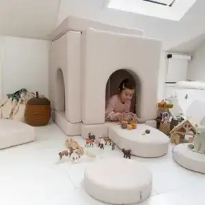 Een van de grootste voordelen van de Shappy Speelbank is de flexibiliteit in gebruik. Dankzij het modulaire ontwerp kunnen de verschillende kussens en onderdelen op talloze manieren worden geconfigureerd. Je kunt de bank gemakkelijk aanpassen aan de activiteit van je kind. Zo kan het ene moment een gezellige leeshoek worden gecreëerd, en het volgende moment een avontuurlijke speelzone.