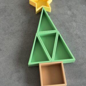 De kleine kerstboom bestaat uit vier groene driehoekige bakjes en één stervorm. Kinderen kunnen de onderdelen gebruiken om te puzzelen, te stapelen of te vullen met verschillende materialen. De set is geschikt voor zowel droog als nat sensorisch spel en kan gebruikt worden in een speelbak of op een vlakke ondergrond.