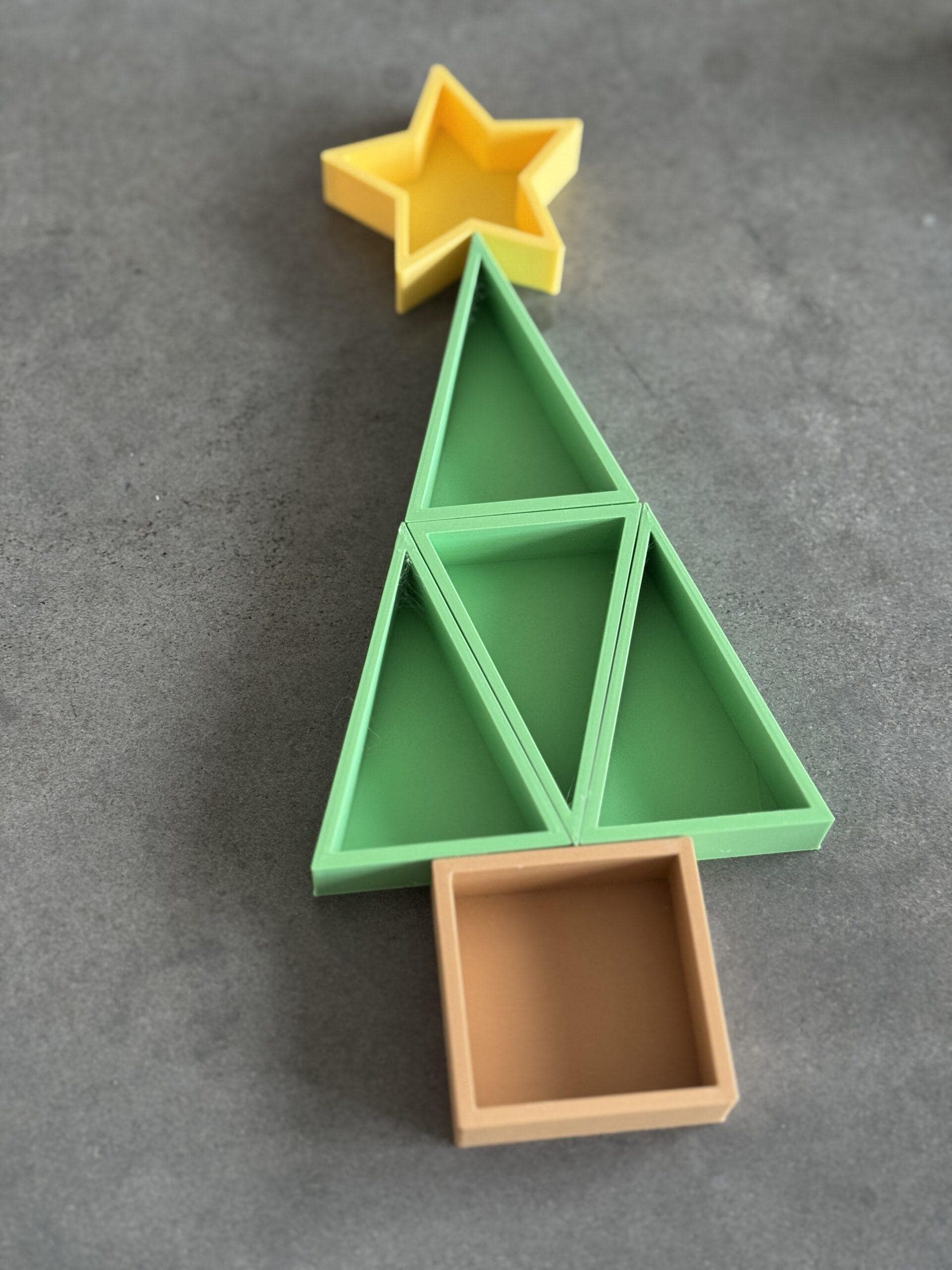 Inhoud: 4 driehoekige bakjes en 1 ster