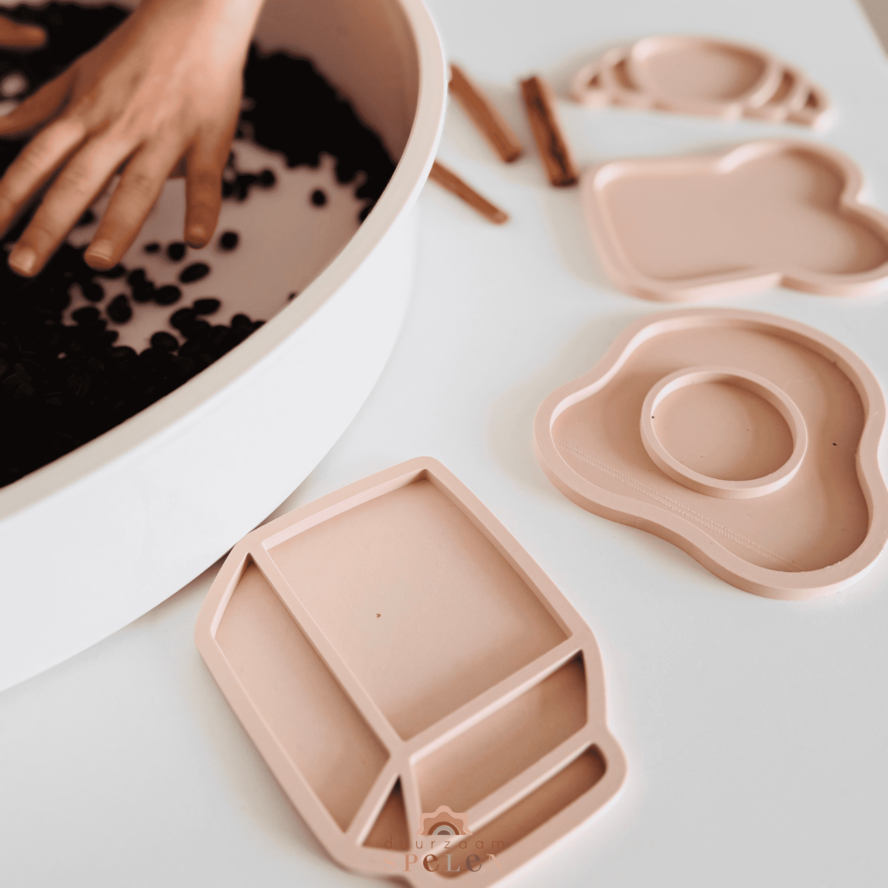 Advies: Gebruik altijd een placemat, speelmat of ander beschermend oppervlak onder de speelomgeving om de ondergrond te beschermen. Wij staan niet garant voor eventuele vlekken of beschadigingen door intensief sensorisch spel, met name op houten of poreuze oppervlakken.
