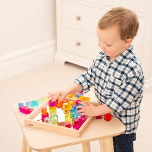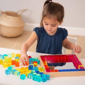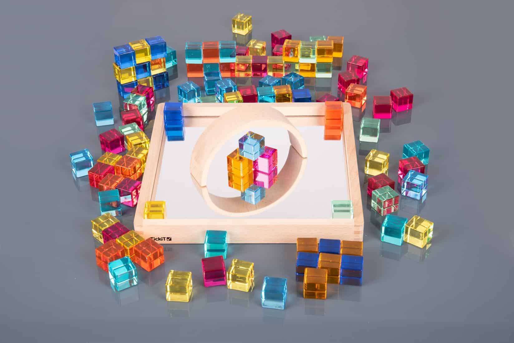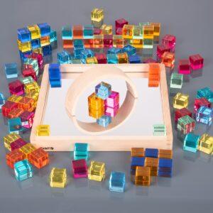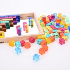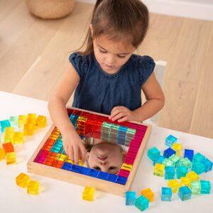 Kleine kinderen kunnen torens bouwen, kleuren sorteren of mooie patronen maken. Oudere kinderen kunnen de kubussen gebruiken om te leren tellen, reeksen te maken en zelfs eenvoudige sommen te ontdekken. De spiegel in de bak maakt het extra leuk: kinderen zien hun bouwwerken terug in het spiegelbeeld en leren zo over symmetrie en reflectie. Zet de kubussen op een lichtpaneel voor een magisch effect: de kleuren lichten prachtig op en creëren een betoverend schouwspel!