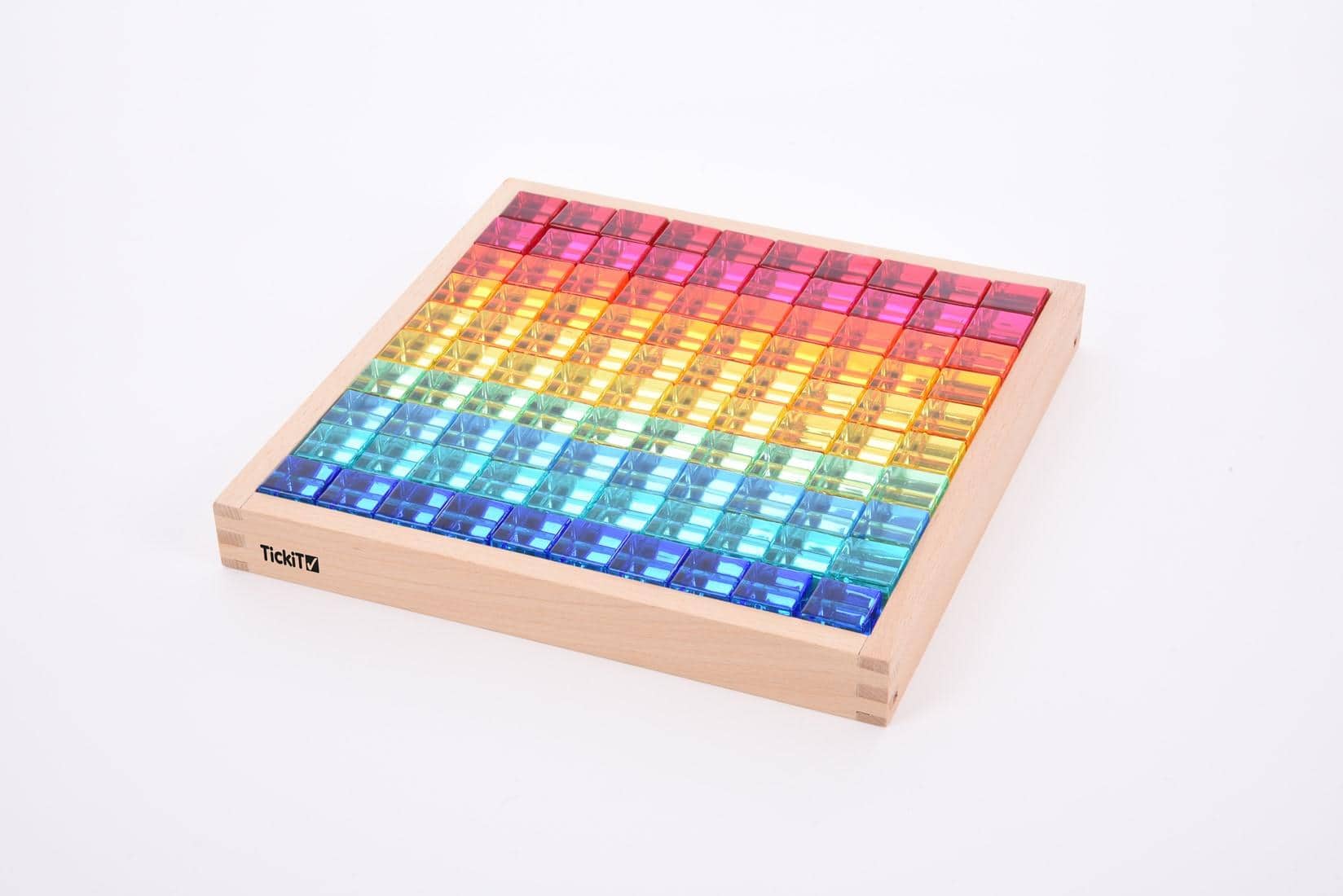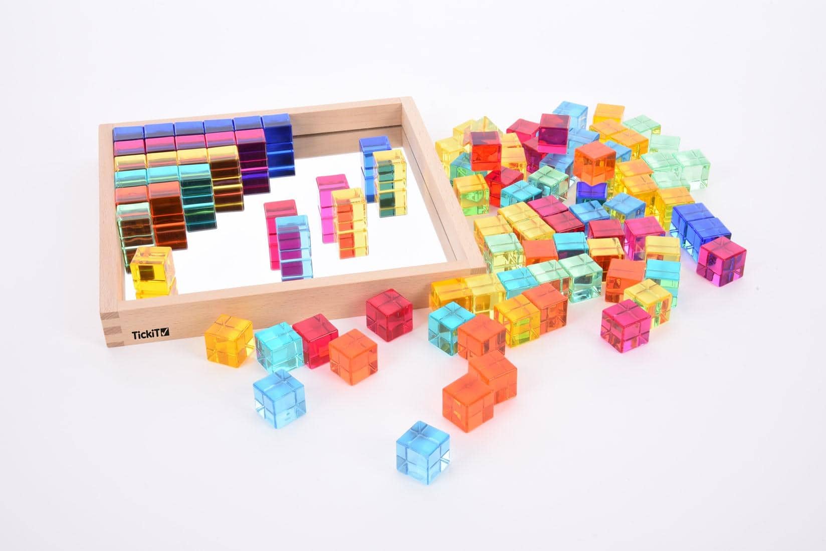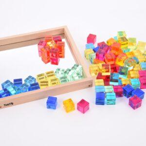 De Tickit® Gem Kubussen zijn een prachtige set van 100 lichtdoorlatende kubussen in een stevige houten bak met een spiegelbodem. De kubussen komen in 10 vrolijke kleuren en hebben gladde randen, waardoor ze veilig en fijn zijn om mee te spelen. Deze set biedt eindeloos speelplezier en helpt kinderen spelenderwijs nieuwe dingen te leren.