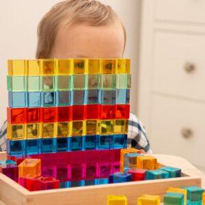 Goed om te weten: De Tickit® Gem Kubussen hebben dezelfde maat als de Lucent Cubes van Bauspiel. Je kunt ze dus samen gebruiken voor nog meer speelopties! Let wel op: het acryl van de kubussen kan breken als ze van een grote hoogte op een harde, betonnen vloer vallen.
