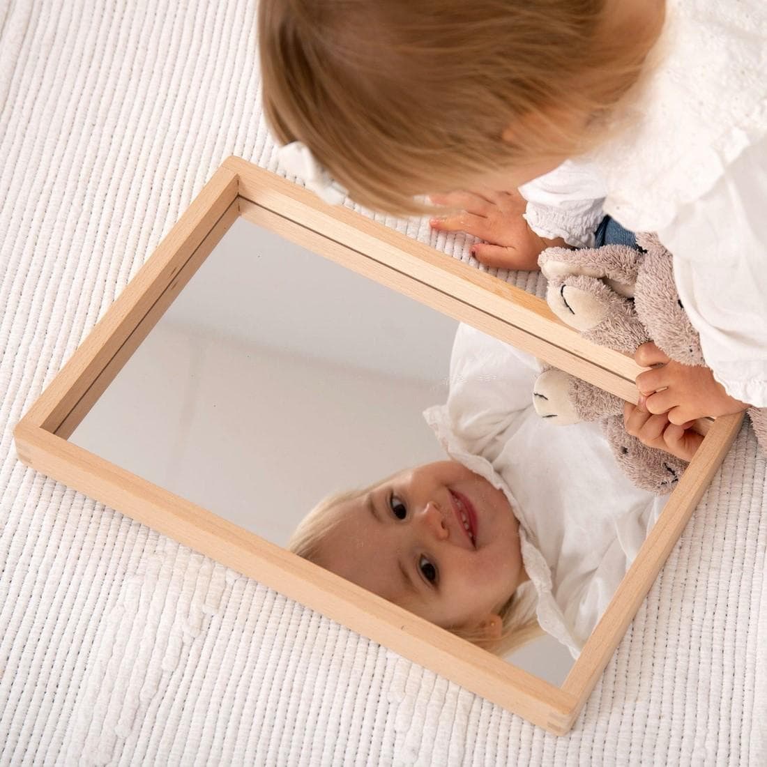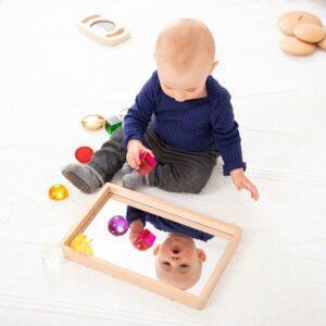 Of ze nu kleine voorwerpen onderzoeken, gezichtsuitdrukkingen uitproberen of hun eigen spiegelbeeld bekijken – deze spiegelbak stimuleert creativiteit en zelfontdekking. Daarnaast helpt het bij de spraakontwikkeling, omdat kinderen zichzelf kunnen zien terwijl ze woorden en klanken oefenen.