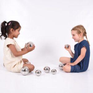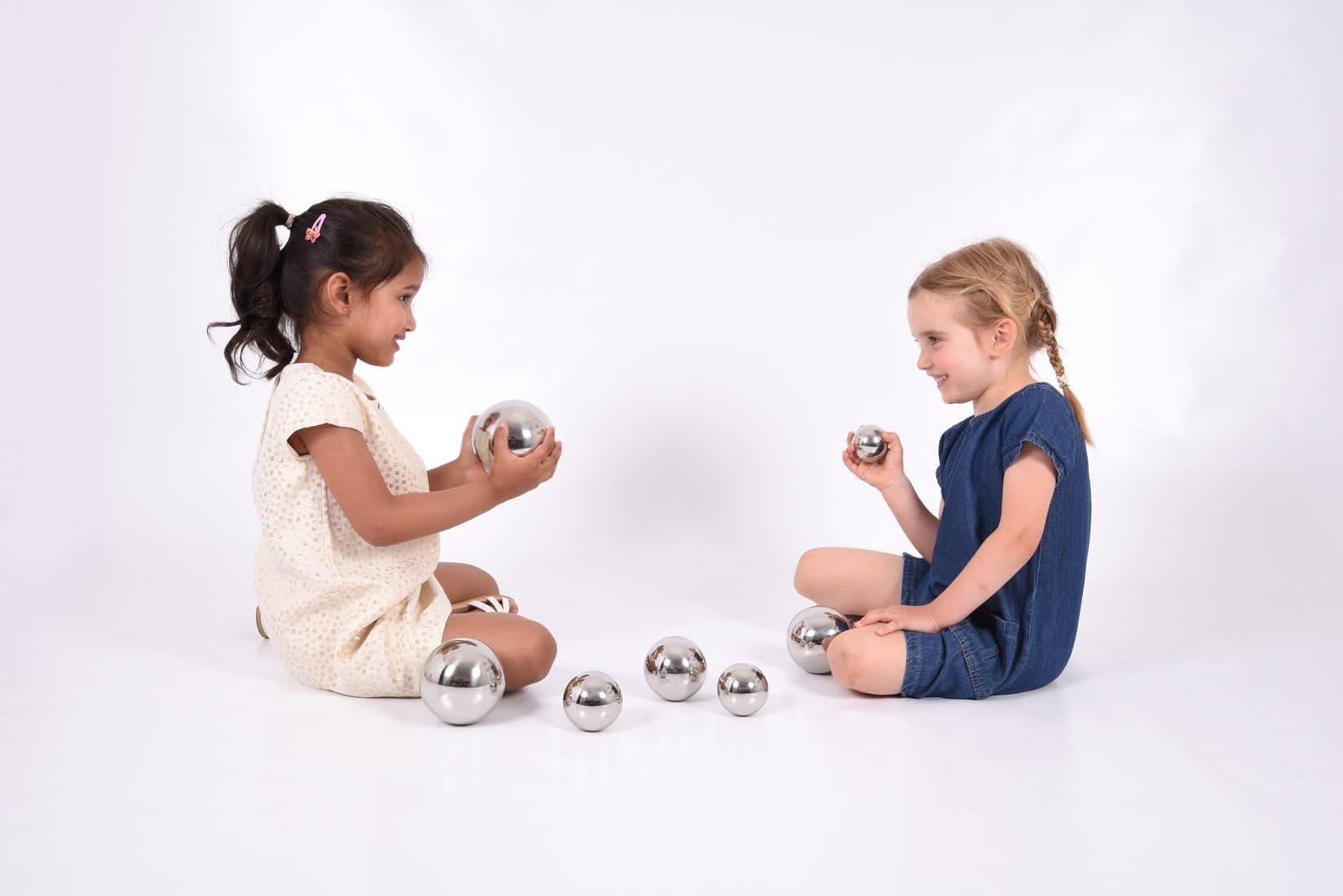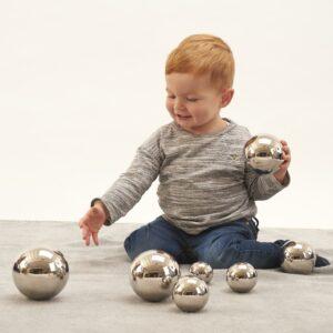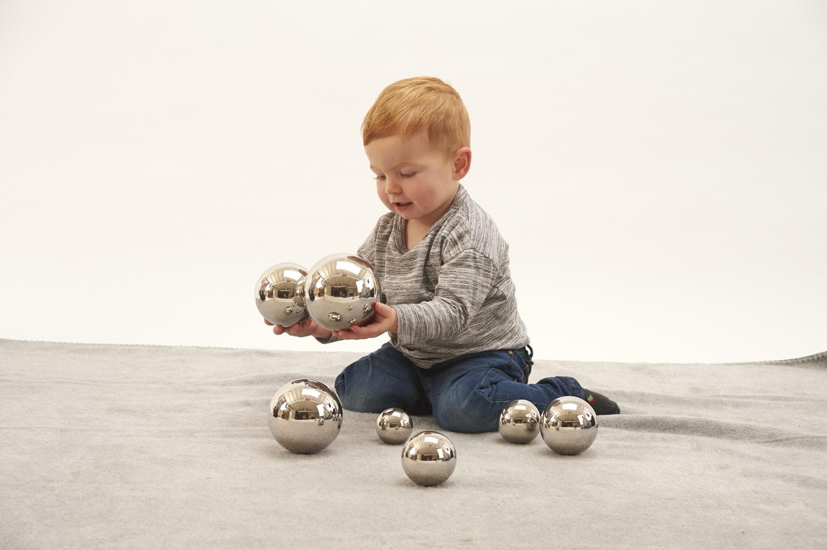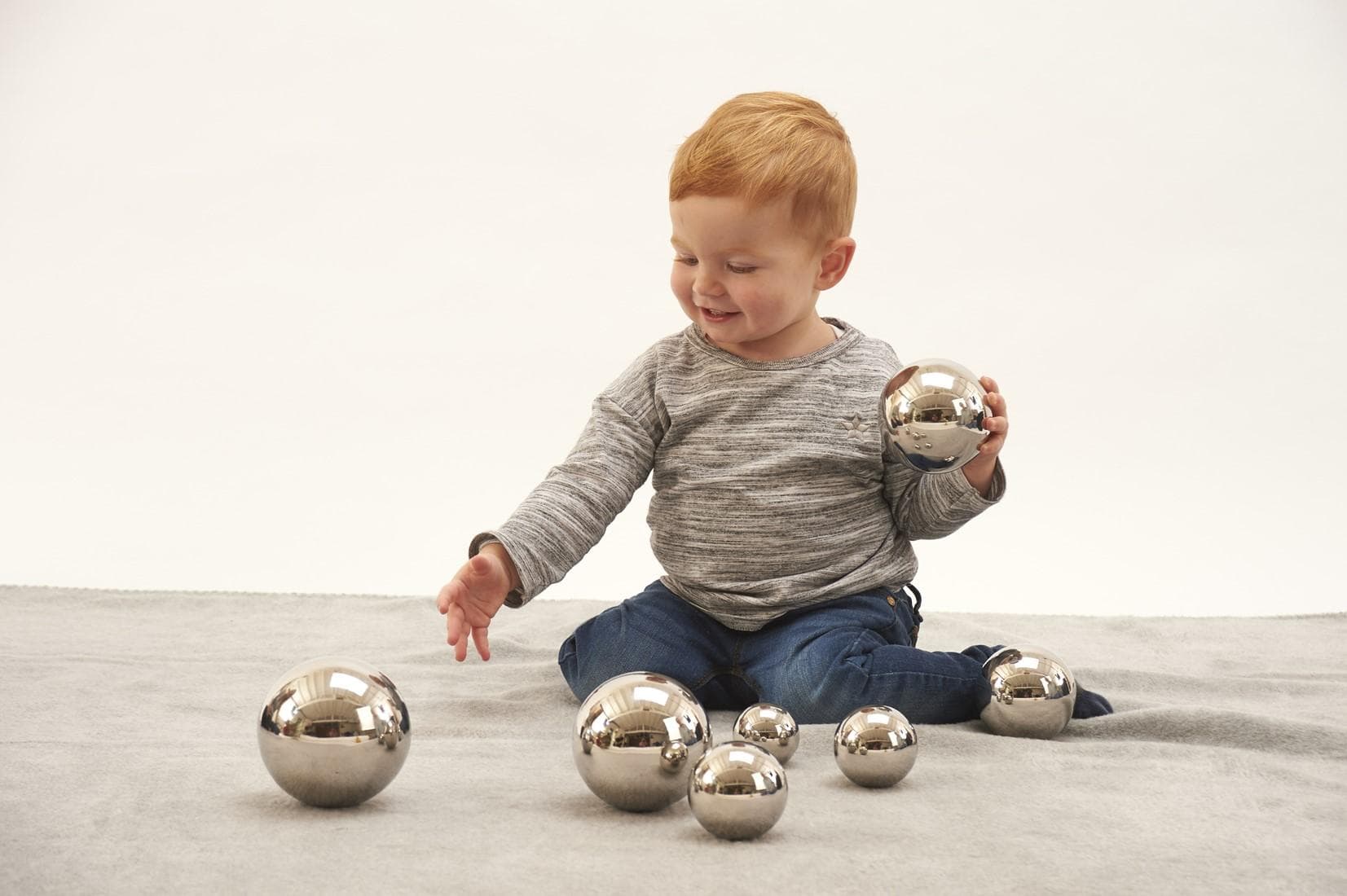 De set bevat zeven reflecterende ballen in verschillende formaten (van 5 cm tot 11 cm). Gemaakt van roestvrij staal, zijn ze niet alleen sterk en duurzaam, maar ook licht genoeg voor kleine handjes om mee te spelen. Bovendien zijn ze veilig en ultrahygiënisch dankzij hun niet-poreuze en bacteriebestendige eigenschappen.