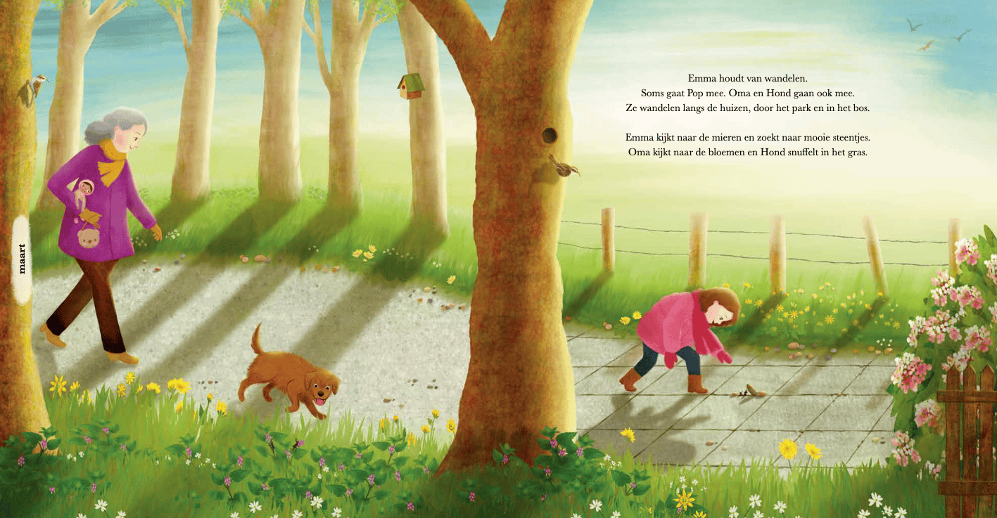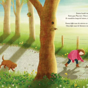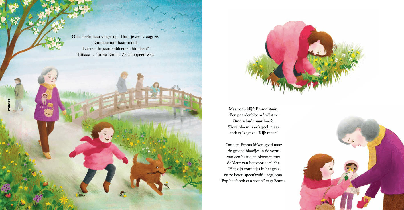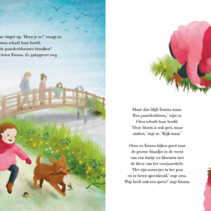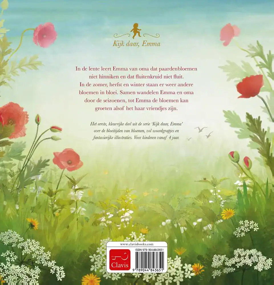 In de lente leert Emma van oma dat paardenbloemen niet hinniken en dat fluitenkruid niet fluit. In de zomer, herfst en winter staan er weer andere bloemen in bloei. Samen wandelen Emma en oma door de seizoenen, tot Emma de bloemen kan groeten alsof het haar vriendjes zijn. Het eerste, kleurrijke deel uit de serie ‘Kijk daar, Emma’ over de bloeitijden van bloemen, vol woordgrapjes en fantasierijke illustraties. Voor kinderen vanaf 4 jaar.